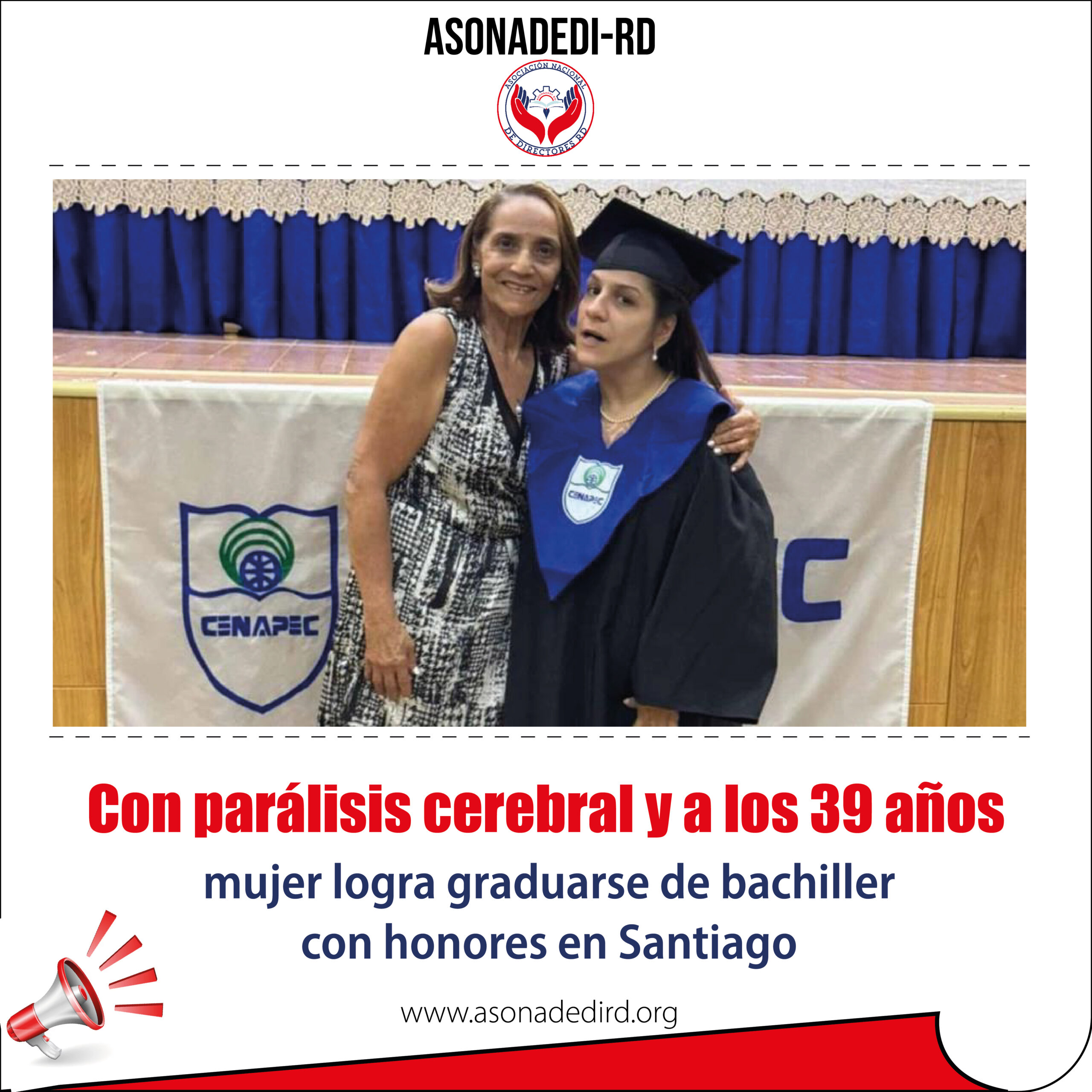 A los 39 años, Esmely Masiel Olivo Sánchez se graduó de bachiller en la provincia Santiago, desafiando las limitaciones de una parálisis cerebral que la acompaña desde su nacimiento.