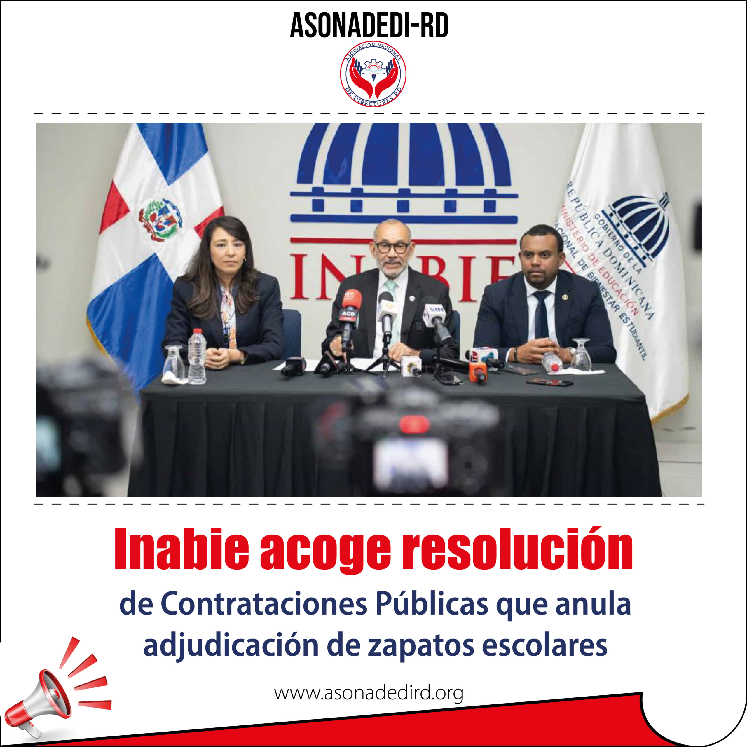 El Instituto Nacional de Bienestar Estudiantil (Inabie) acogió la resolución RIC-0106-2025 de la Dirección General de Contrataciones Públicas (DGCP) que anula parcialmente las adjudicaciones de calzados escolares, y otras disposiciones administrativas ejecutadas por la DGCP.