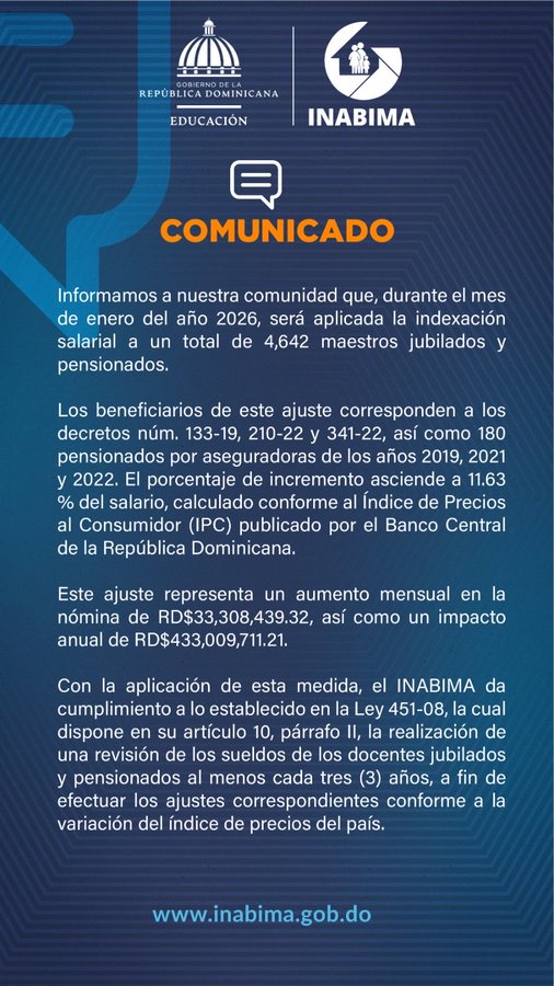 El Instituto Nacional de Bienestar Magisterial (Inabima) informó que durante el mes de enero de 2026 será aplicada la indexación salarial a un total de 4,642 maestros jubilados y pensionados.